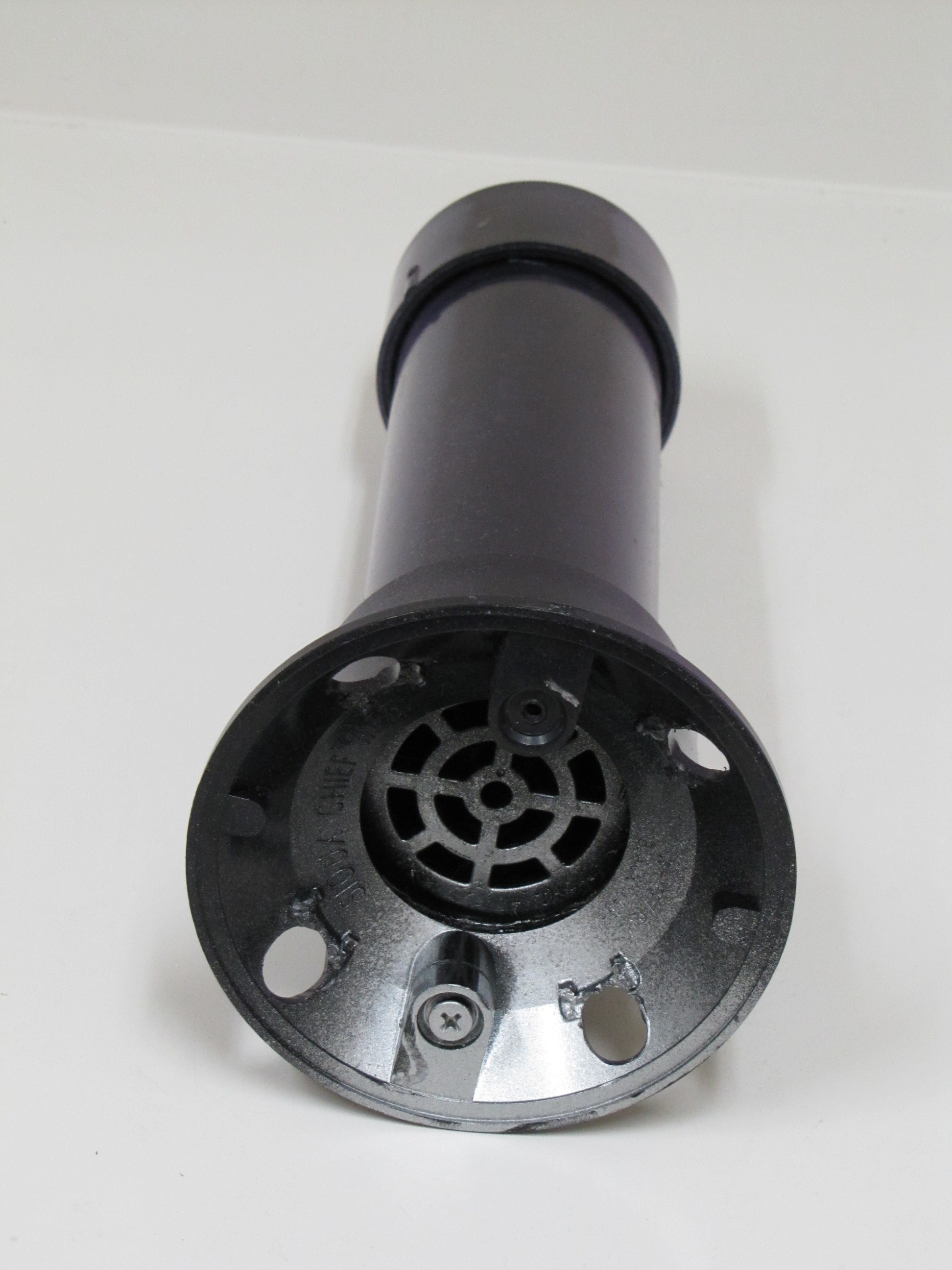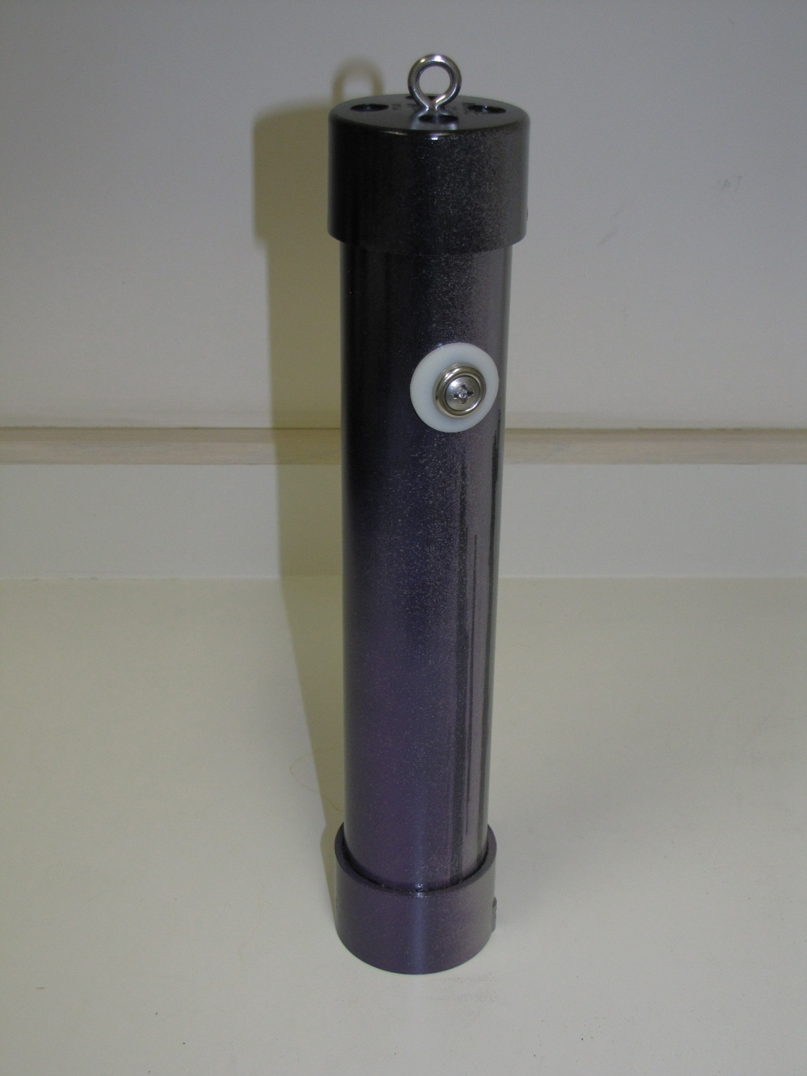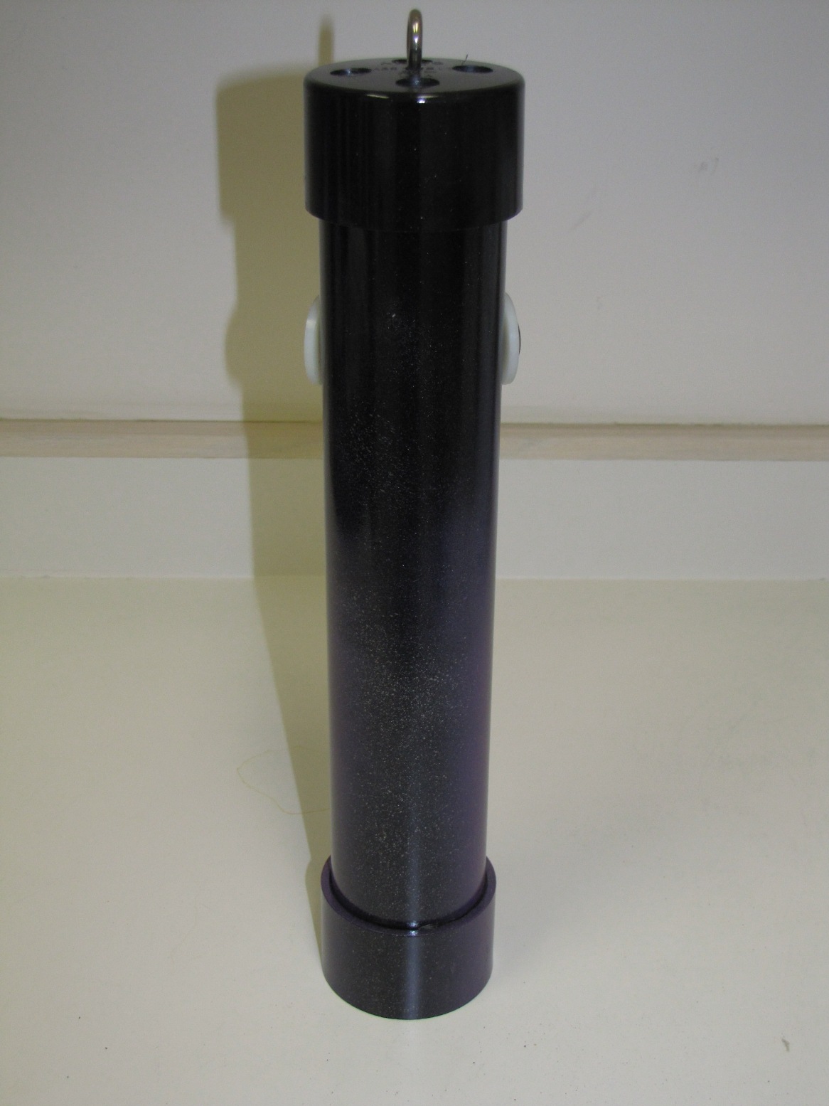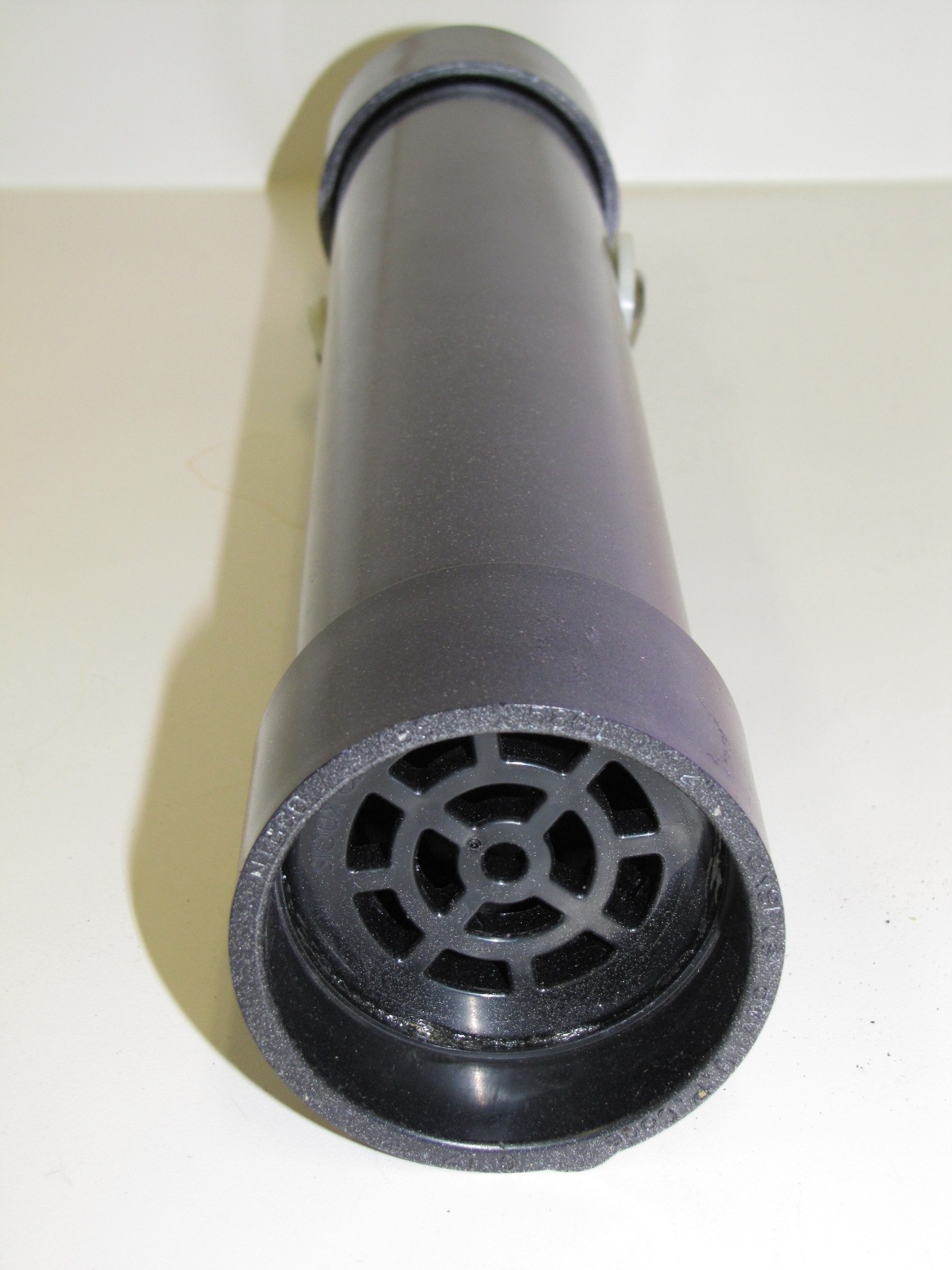 INSTRUCTIONS: Cut pipe to desired length. This one is a 12"pipe and an overall length of about 14" . Drill four 1/2 inch holes in the large drain "tail" to make smoke. Insert the small drain piece in the bottom (no glue) and then attach the large floor drain "tail" with PVC glue. This piece comes with a stainless steel bottom plate that you can leave or remove. You can use a rounded (white) or flat (black) cap for the front end. Drill four 1/2" holes in the cap plus a 1/8" hole dead center for the stainless steel eye bolt. Mount the eye bolt with a flat and lock washer. Use a set screw on the front cap rather than glue so that you can remove the cap and play with the number of marbles inside. I start with five and it really rattles. Drill a small hole for the set screw when the cap is tightly in place. I use a counter-sink on the set screw hole so it is flush. I mounted a little weight in the bottom of the tail to help it run in the correct vertical position (not shown in these photos). Personally, I do not mind it turning because it looks like the fish is panicking or hurt.
